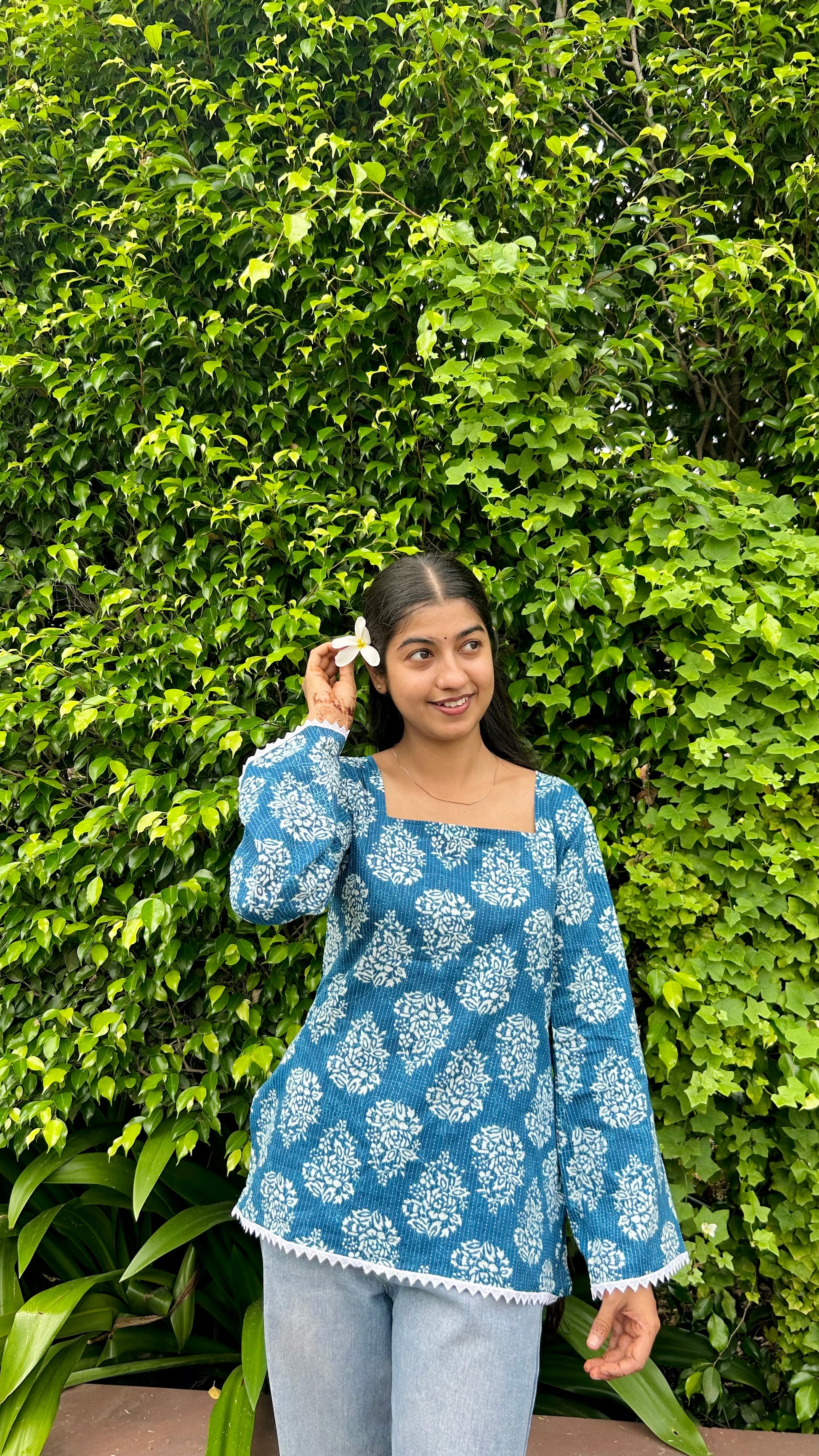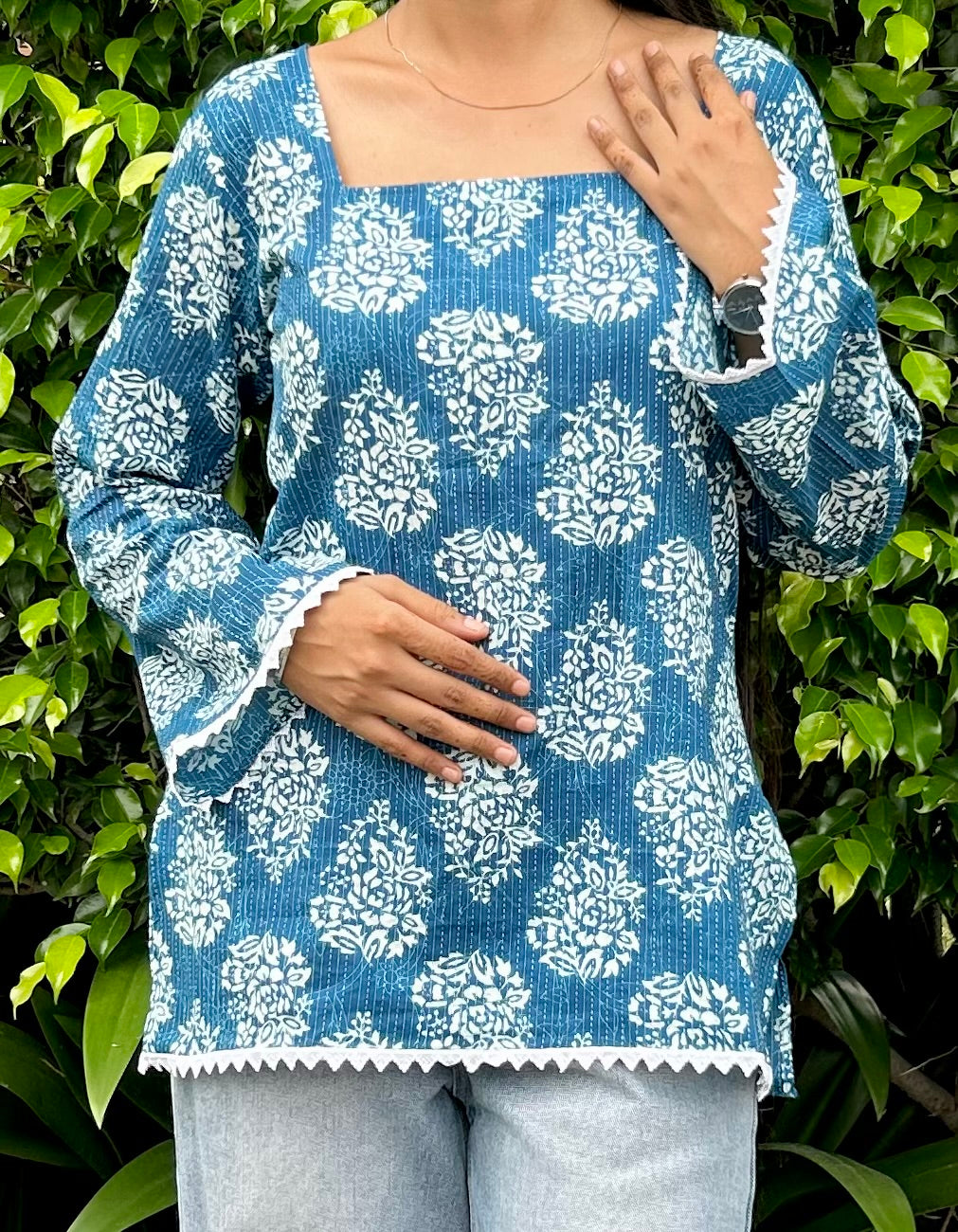 Elevate your ethnic-fusion wardrobe with our Neel Pushpkala Cotton Kurti. Designed in a soothing blue shade with traditional white floral prints.