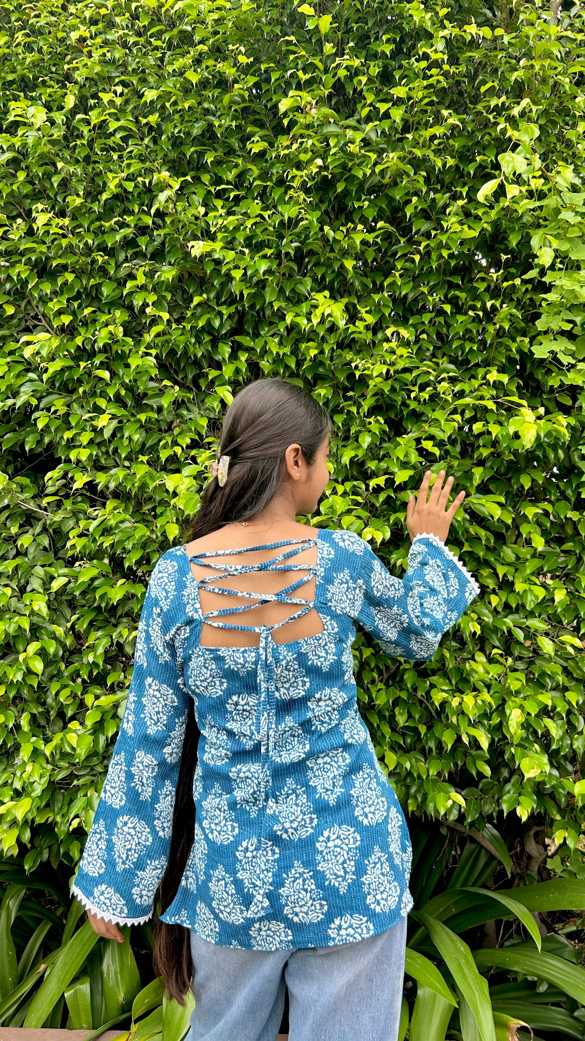 The highlight is its stylish square neckline in the front and the unique lace-up tie-up back design, giving it a contemporary twist. Crafted in soft, breathable cotton, it ensures comfort while keeping you effortlessly chic all day long.