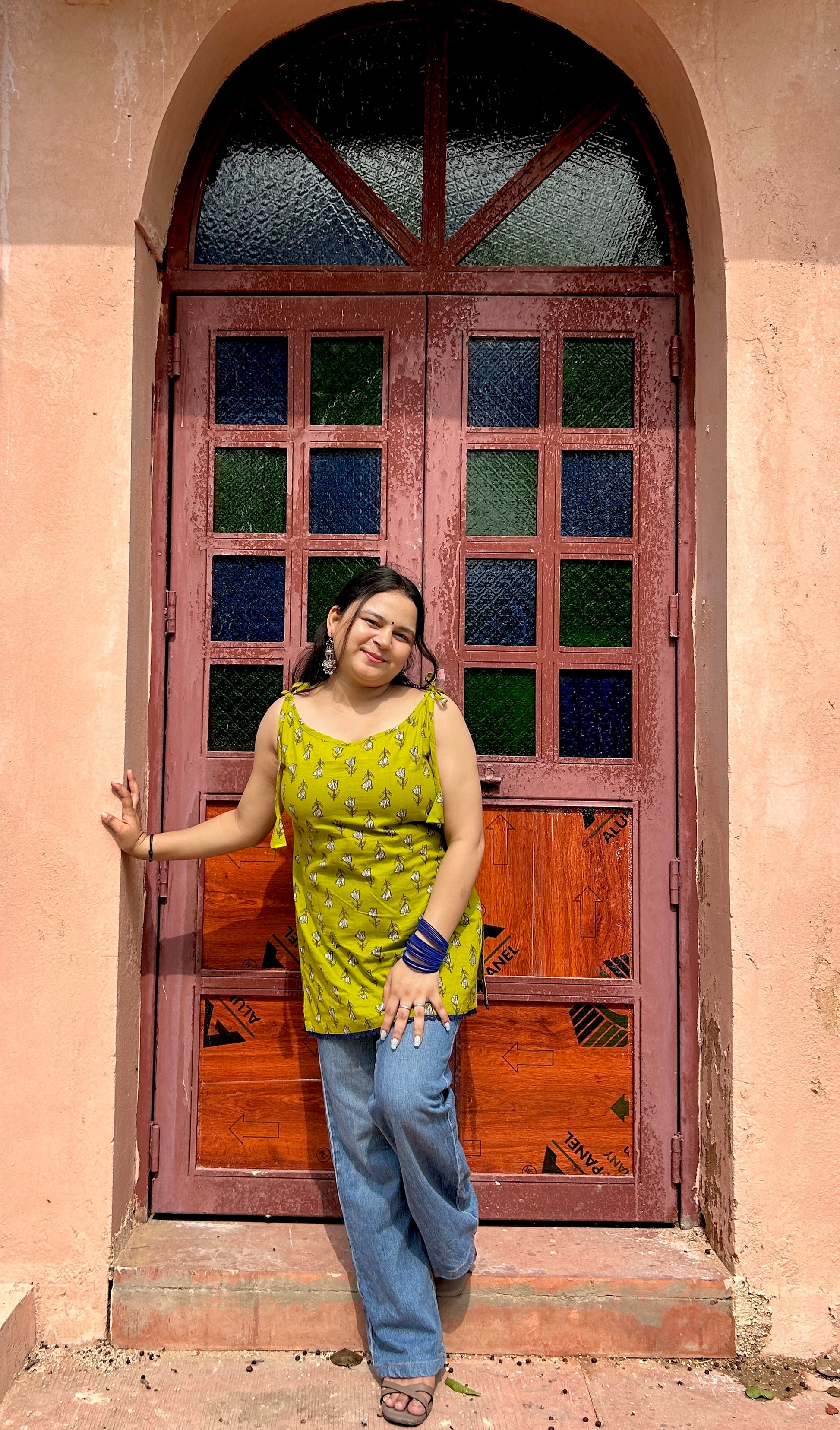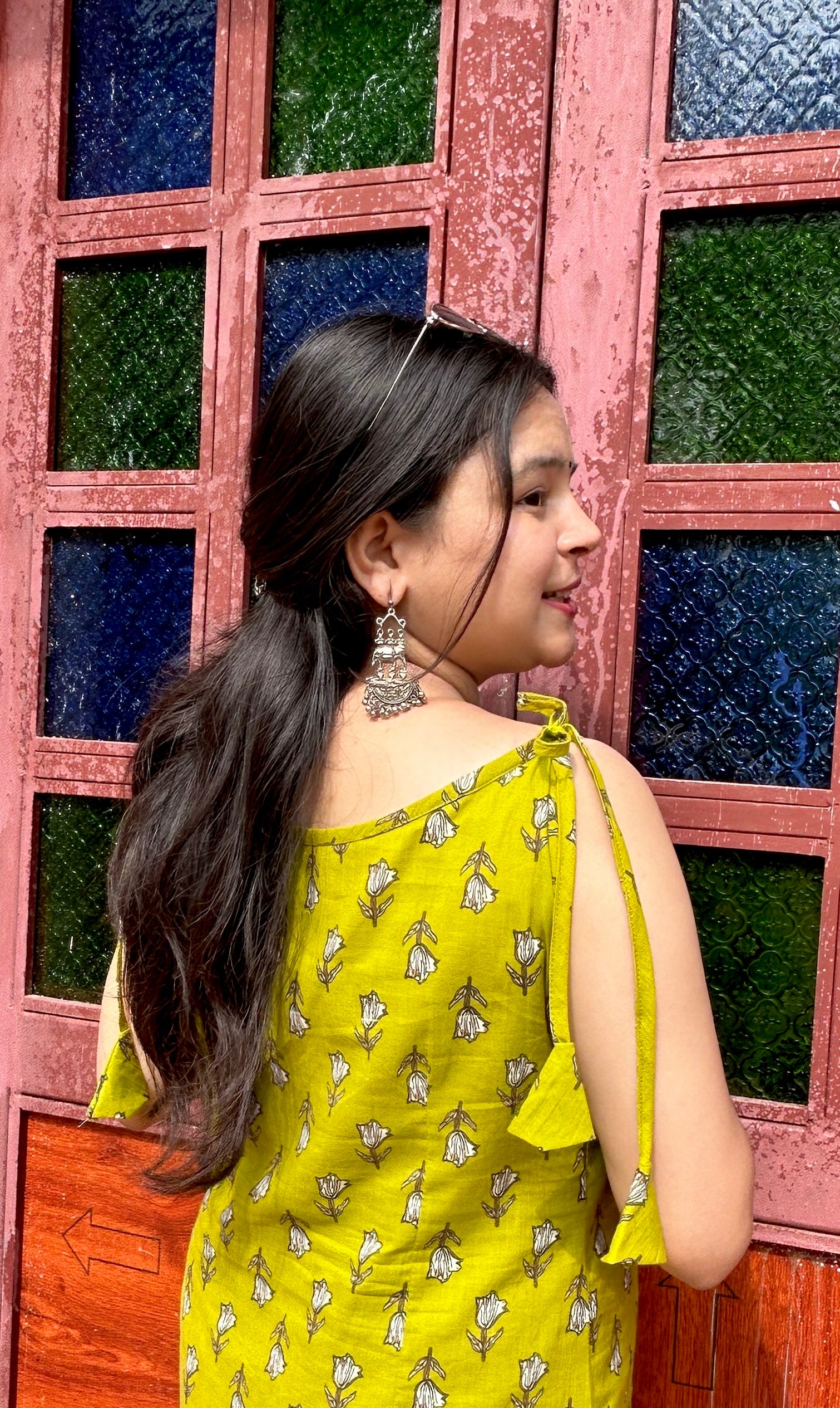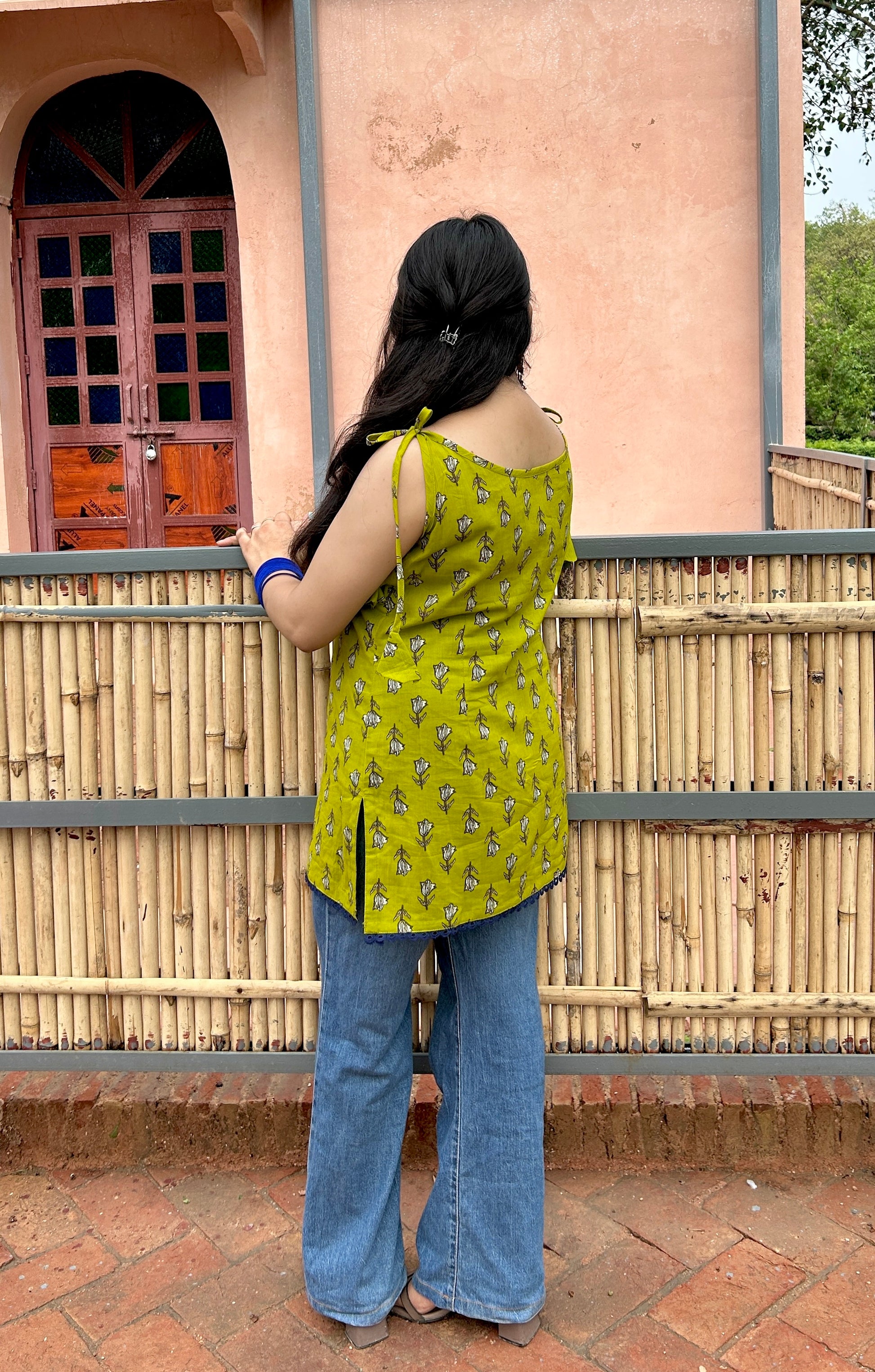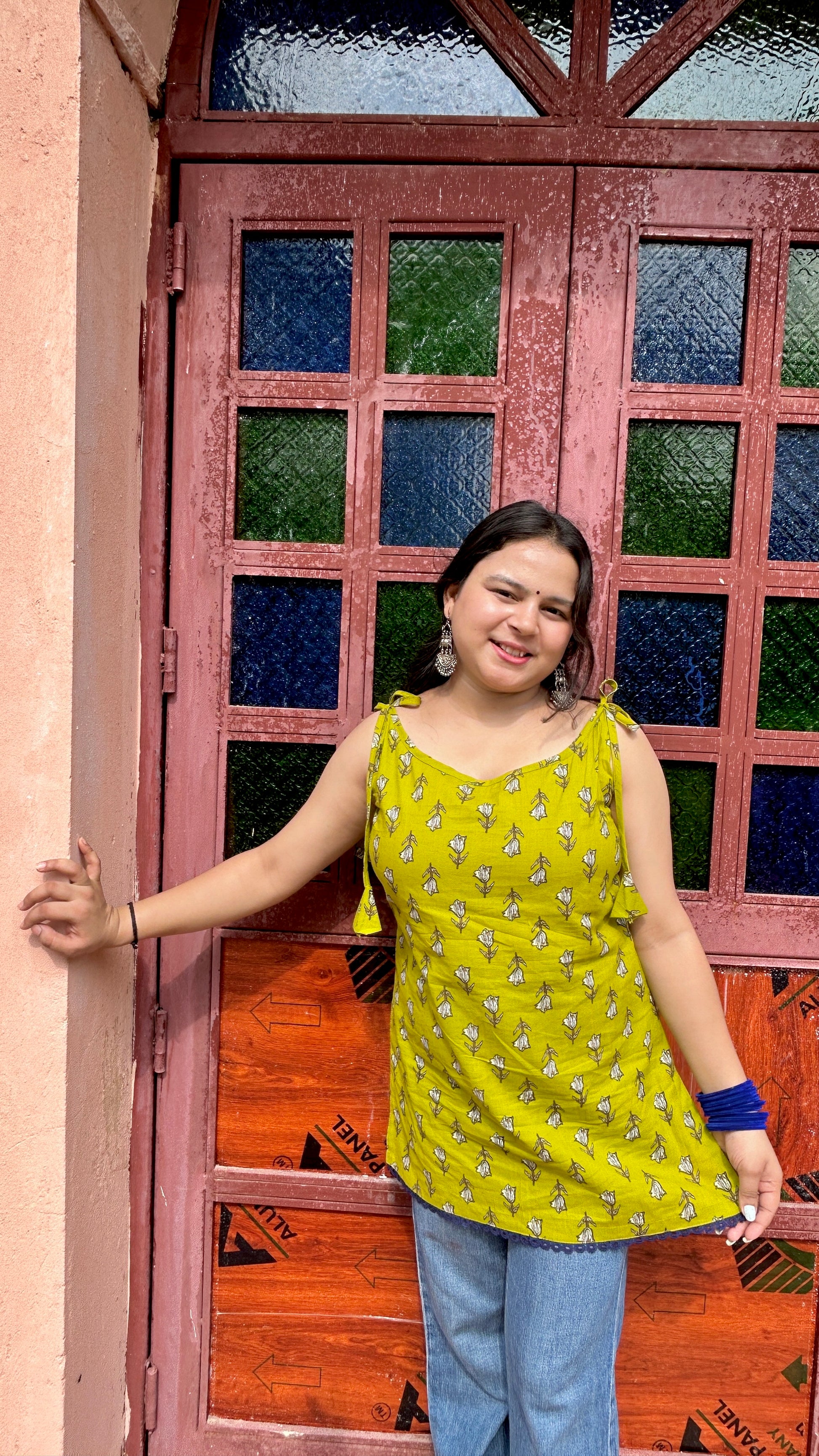 Brighten up your wardrobe with this cheerful lime green cotton kurti adorned with delicate floral prints. The stylish tie-up shoulder straps add a playful touch, making it perfect for summer days and casual outings. Designed with a flattering straight cut and soft fabric, it promises all-day comfort and an effortless chic